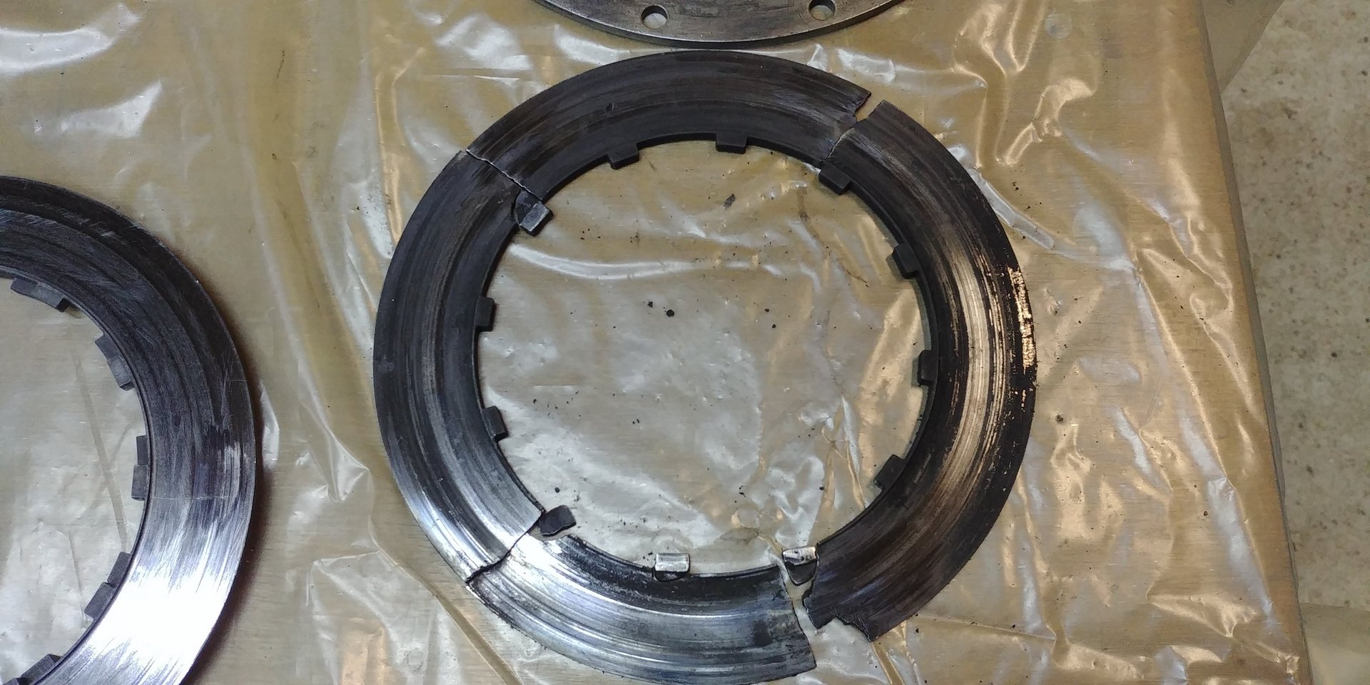 Co jsme objevili bylo horší, než jsme čekali. Prasklé a vzpříčené spojkové lamely, což jsme samozřejmě zjistili až po vyjmutí motoru a demontáži spojky. Ocelové kluzné vypadaly že jsou snad dokonce původní ale na protikusech bylo zřejmé již měněné obložení.